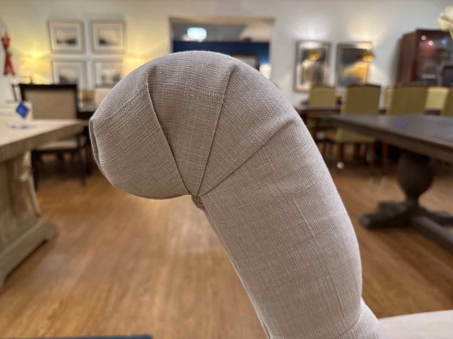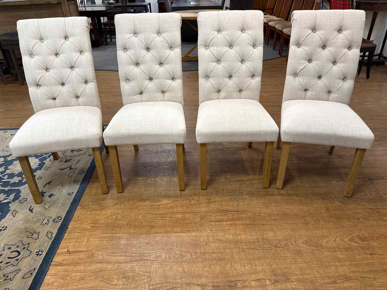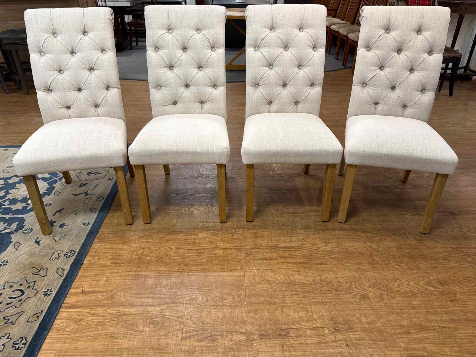 Set of 4 tufted back dining side chairs in off-white linen fabric, oak feet