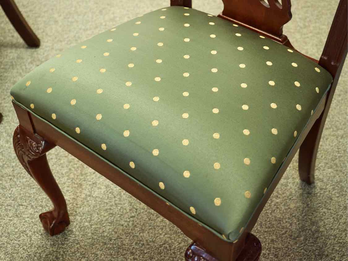 Set of 6 Chippendale Style Dining Chairs with Green & Gold Seat Cushions