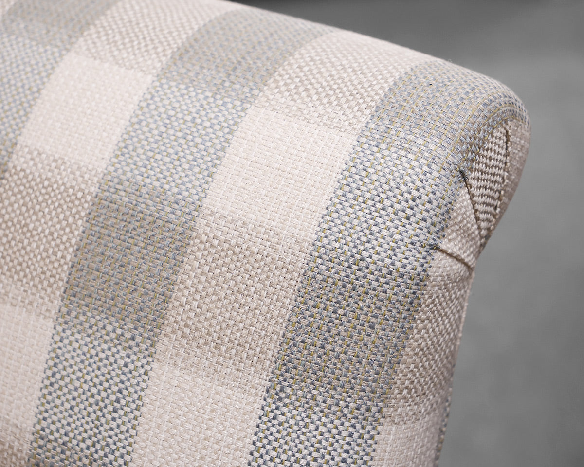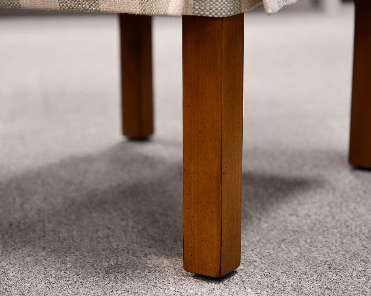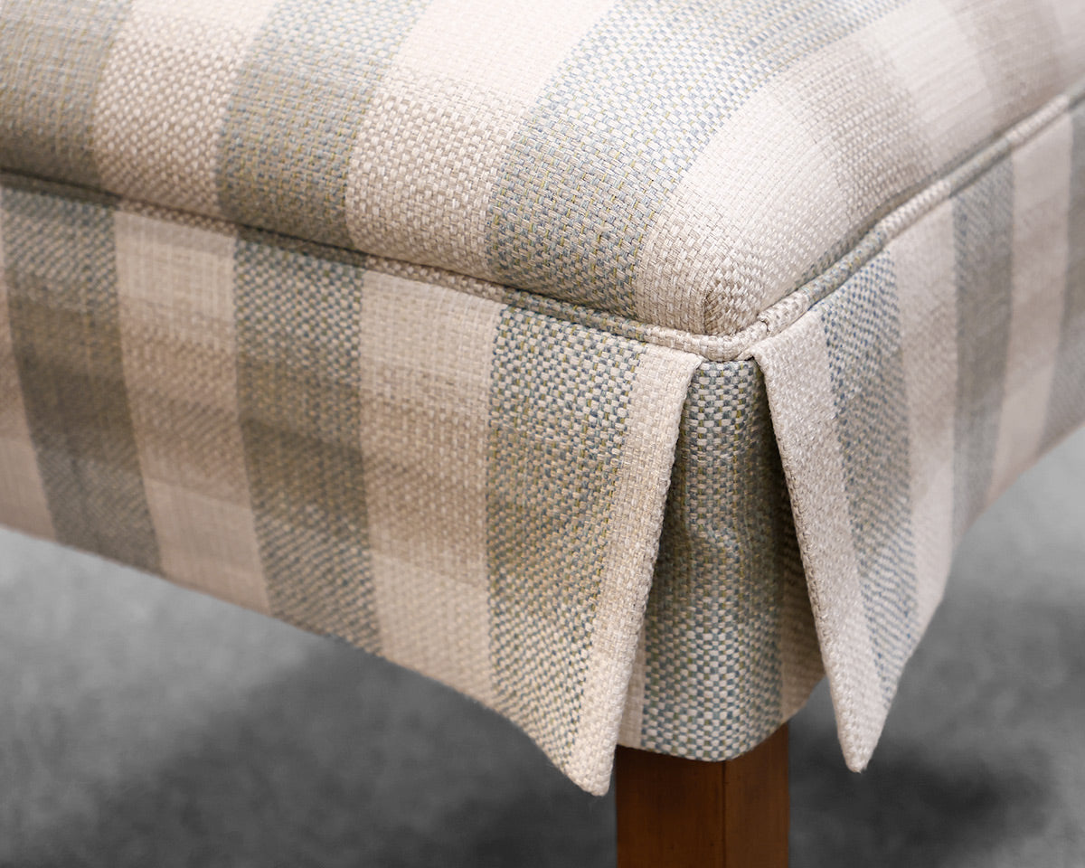 Set of 6 skirted dining chairs, in sea foam green, beige and ivory check upholstery.