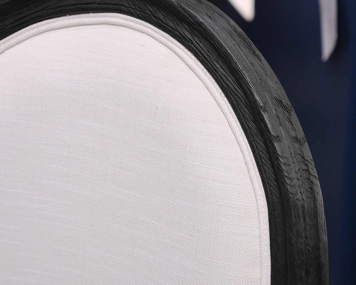 Set of 8 "Vintage French Round" dining chairs in white linen on black finish carved wood frame (2A, 6S)