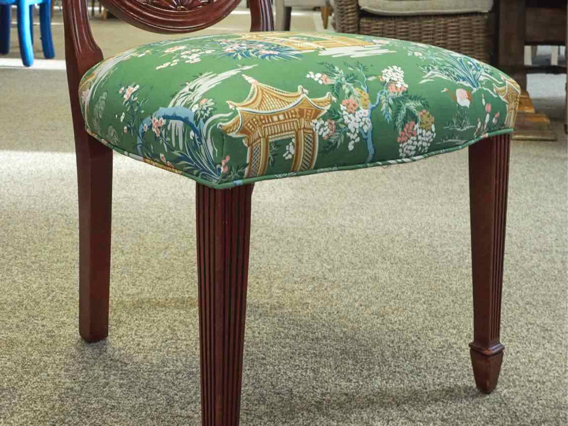 Set of Six Mahogany Shield Back Dining Chairs W/ Kelly Green Pagoda Upholstery