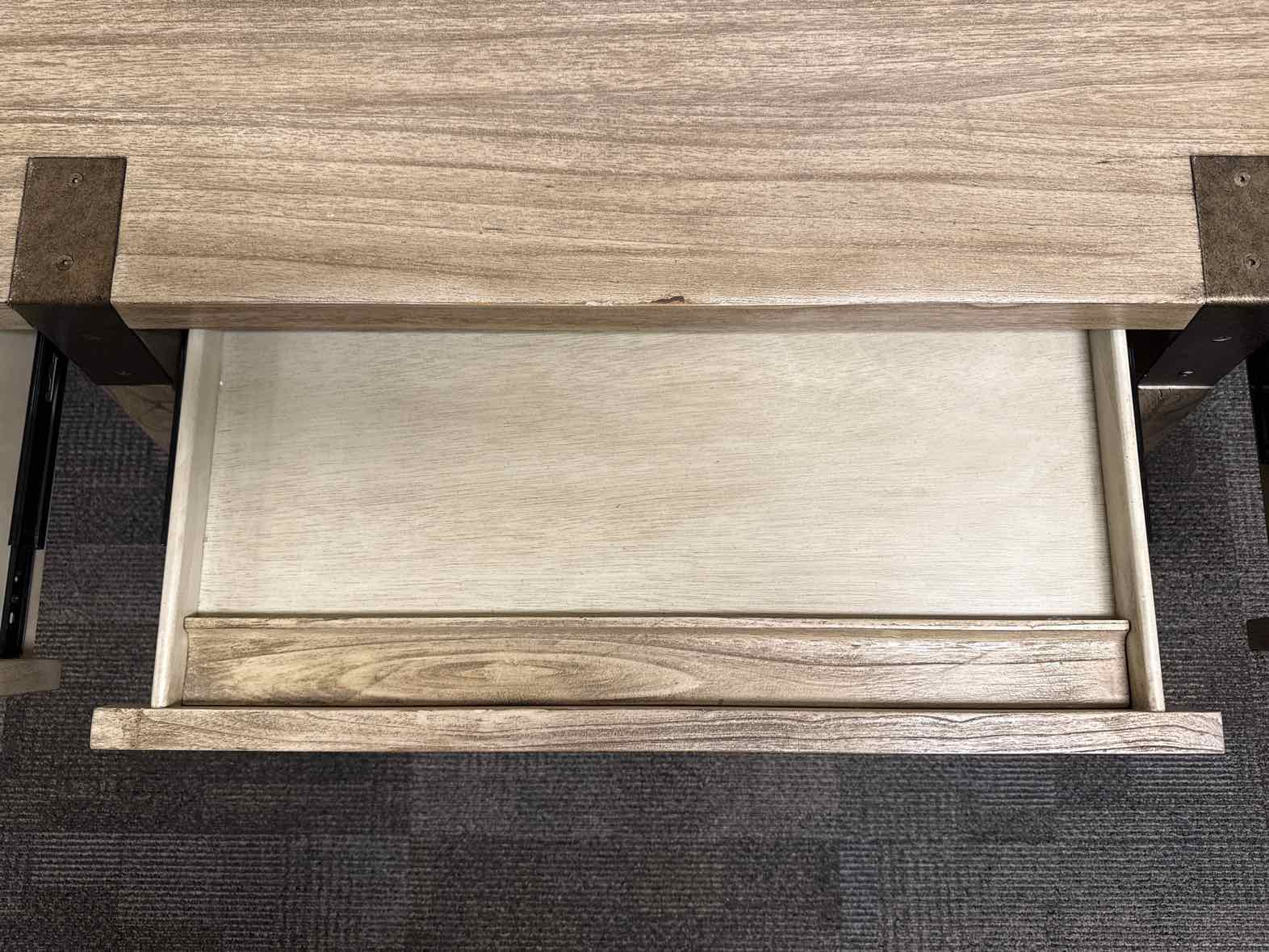 Barton Creek 'Wyatt' driftwood gray weathered wood top desk with metal straps and leg supports