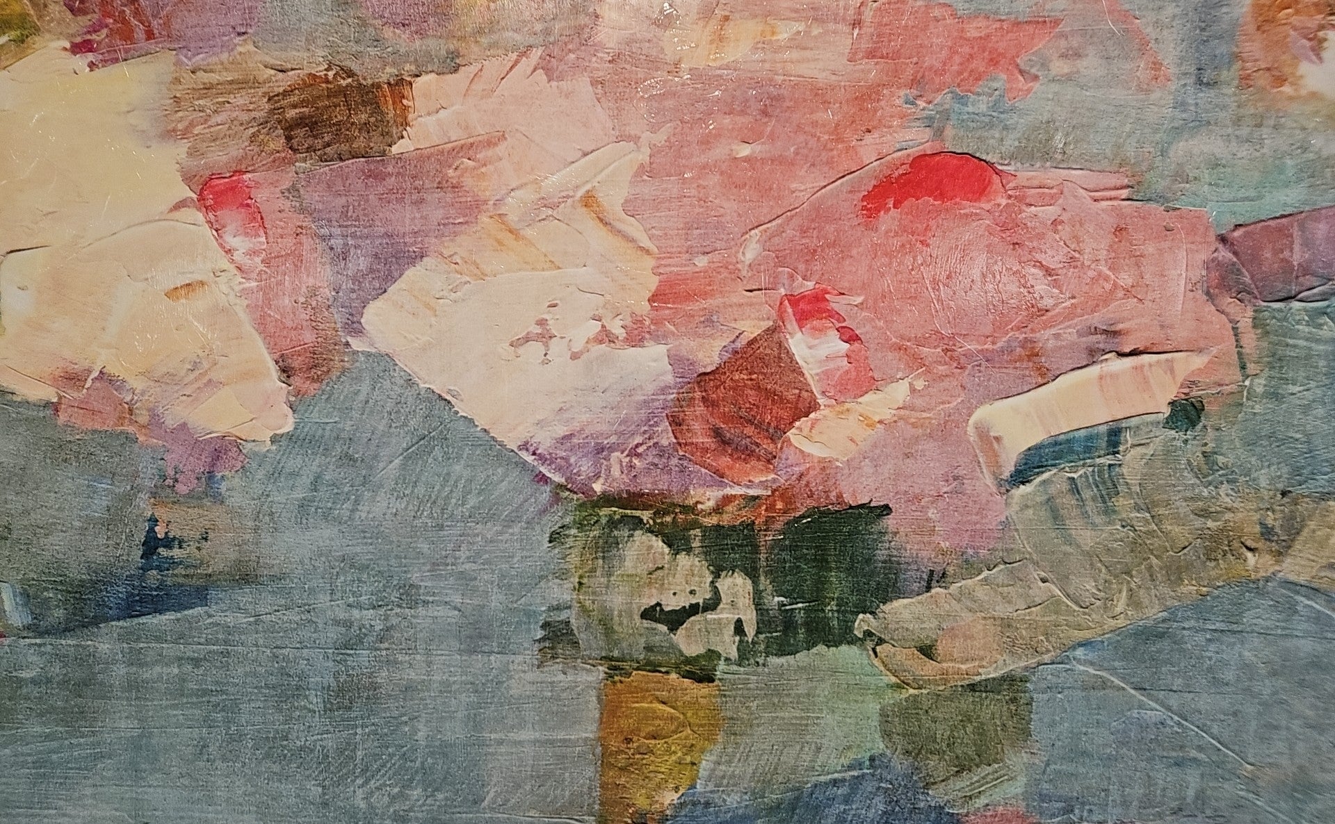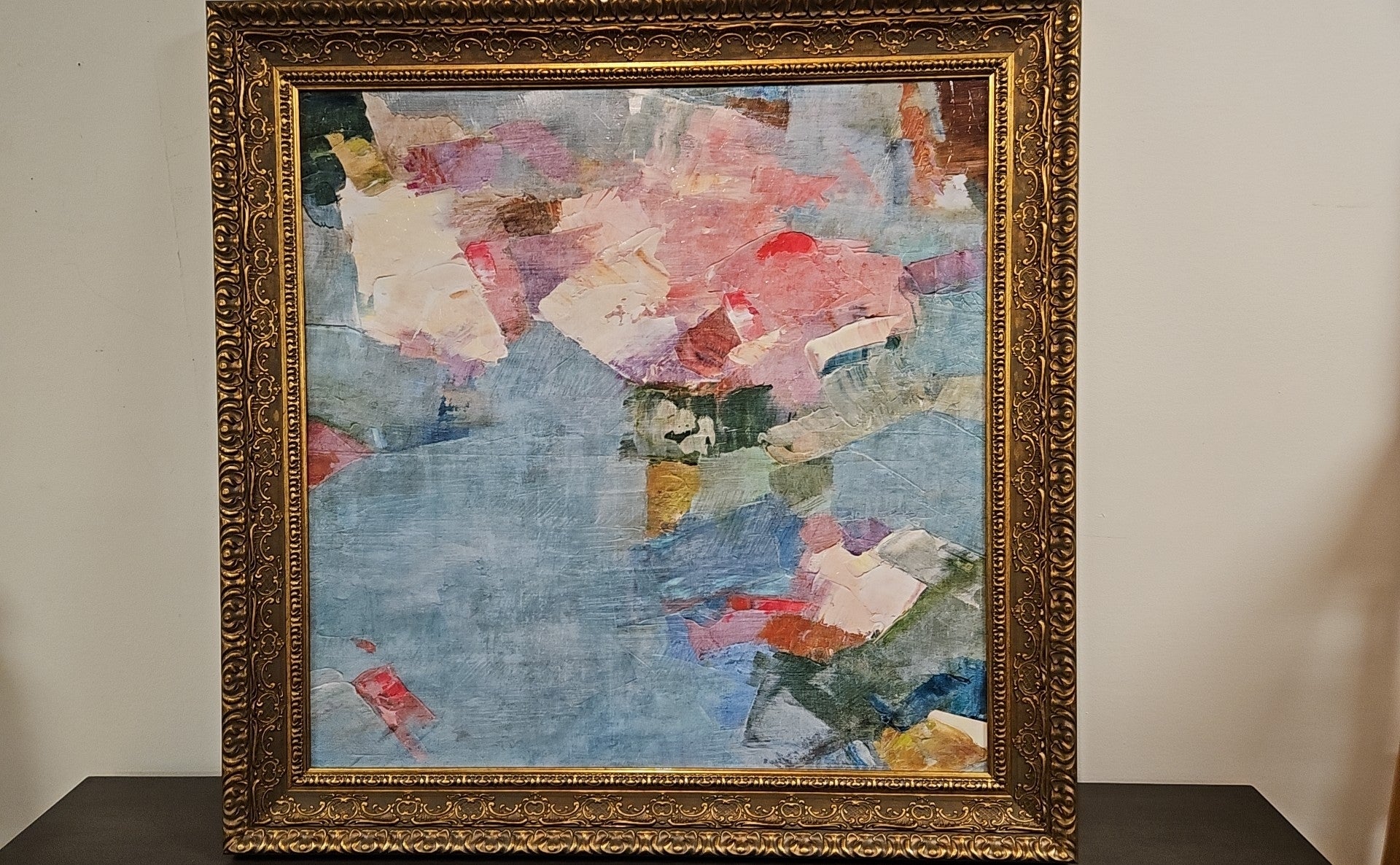 'Snap Dragon' abstract with pink, light blue & green in a gel finish, antique gold frame