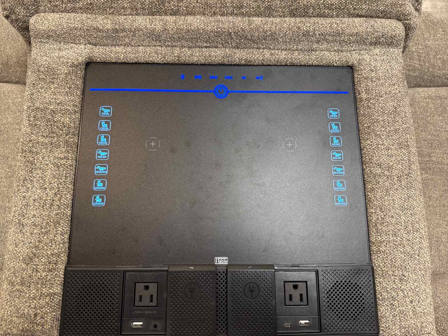 'Austin' 3-seat power reclining sofa with cup holders, middle seat features drop down table w/ charging ports