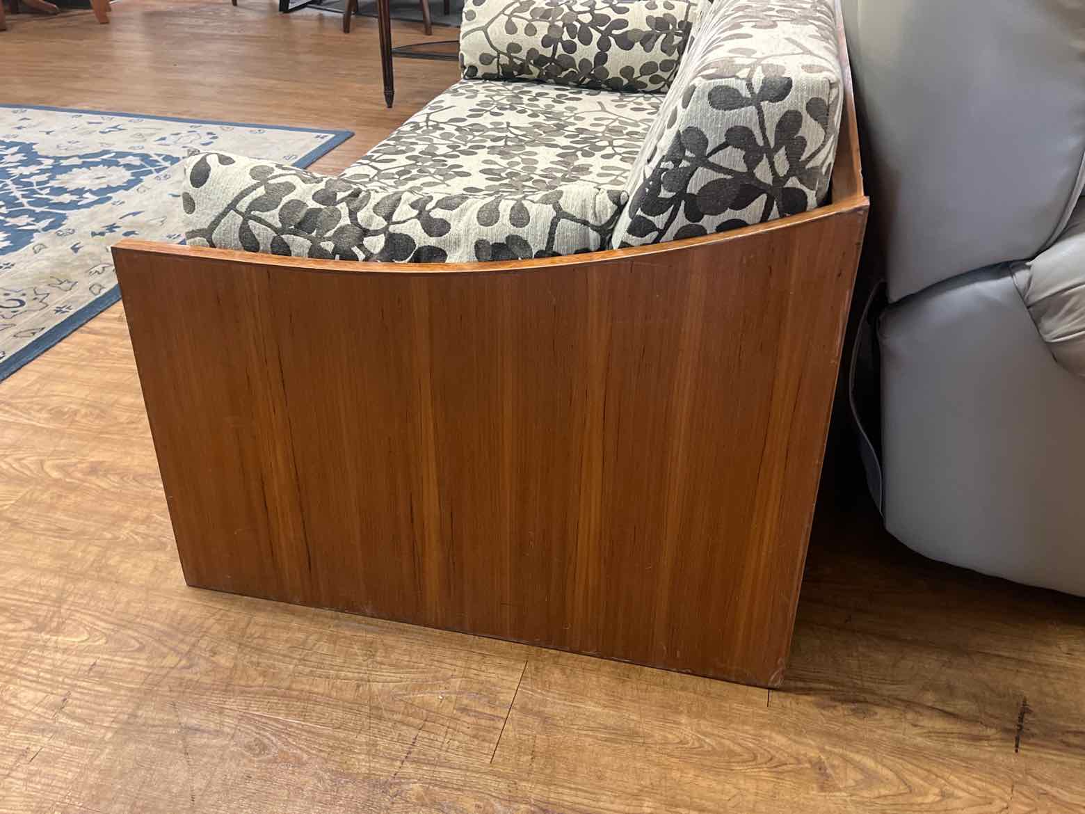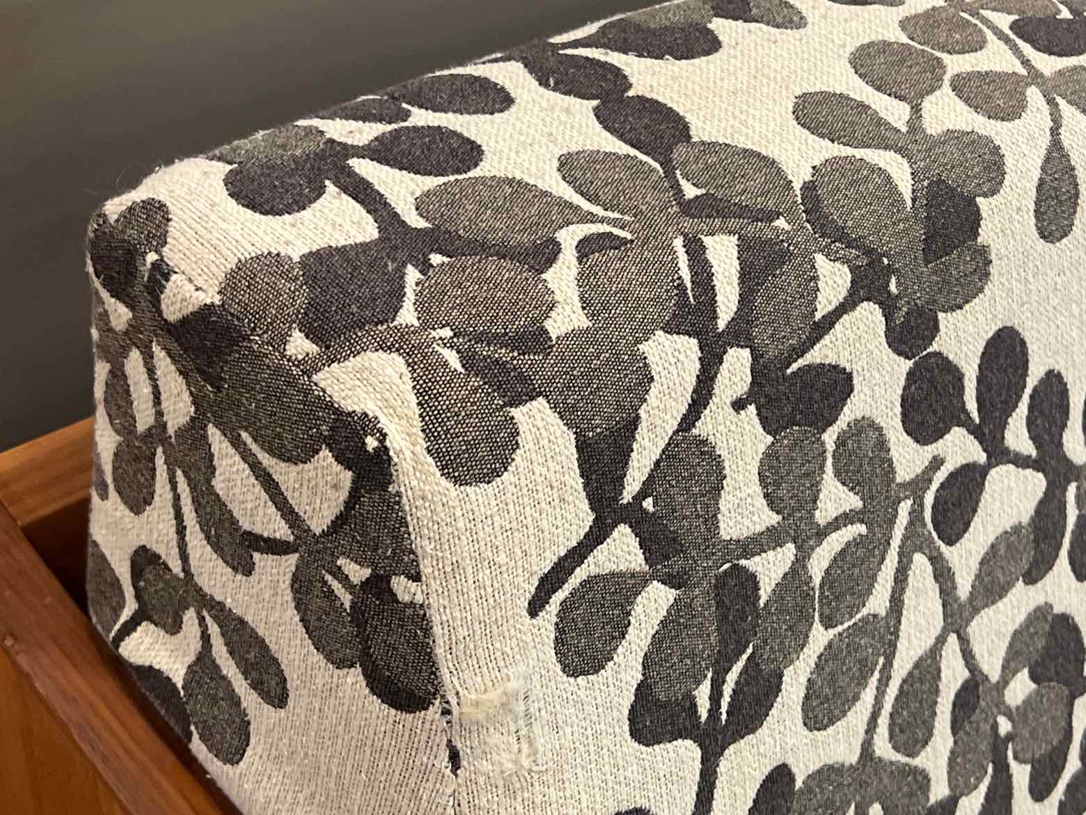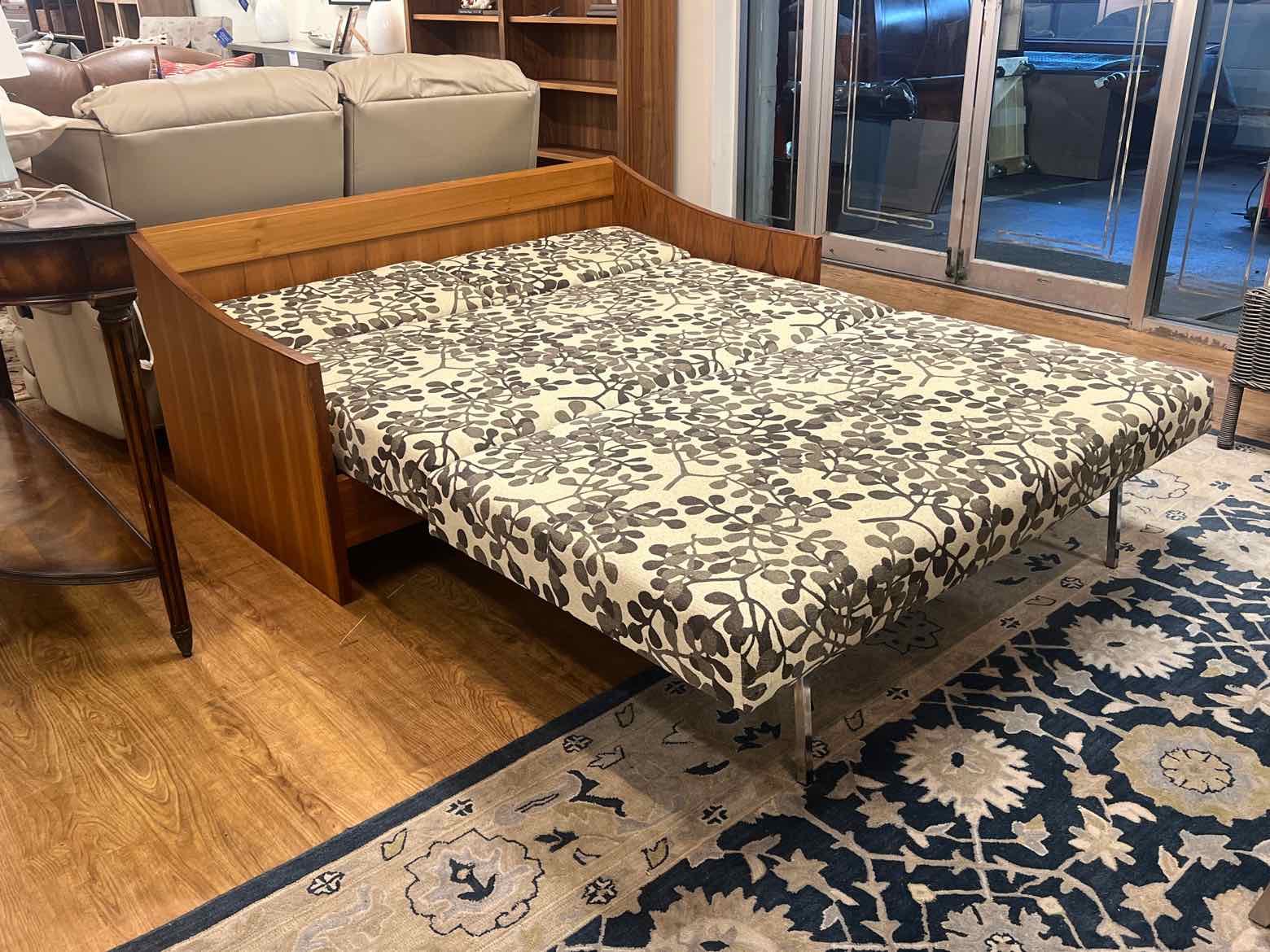 Teak mid-century queen futon with warm grey plant pattern upholstery