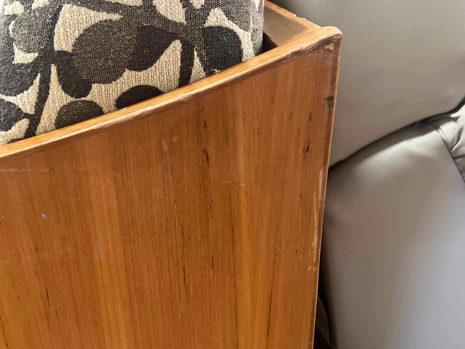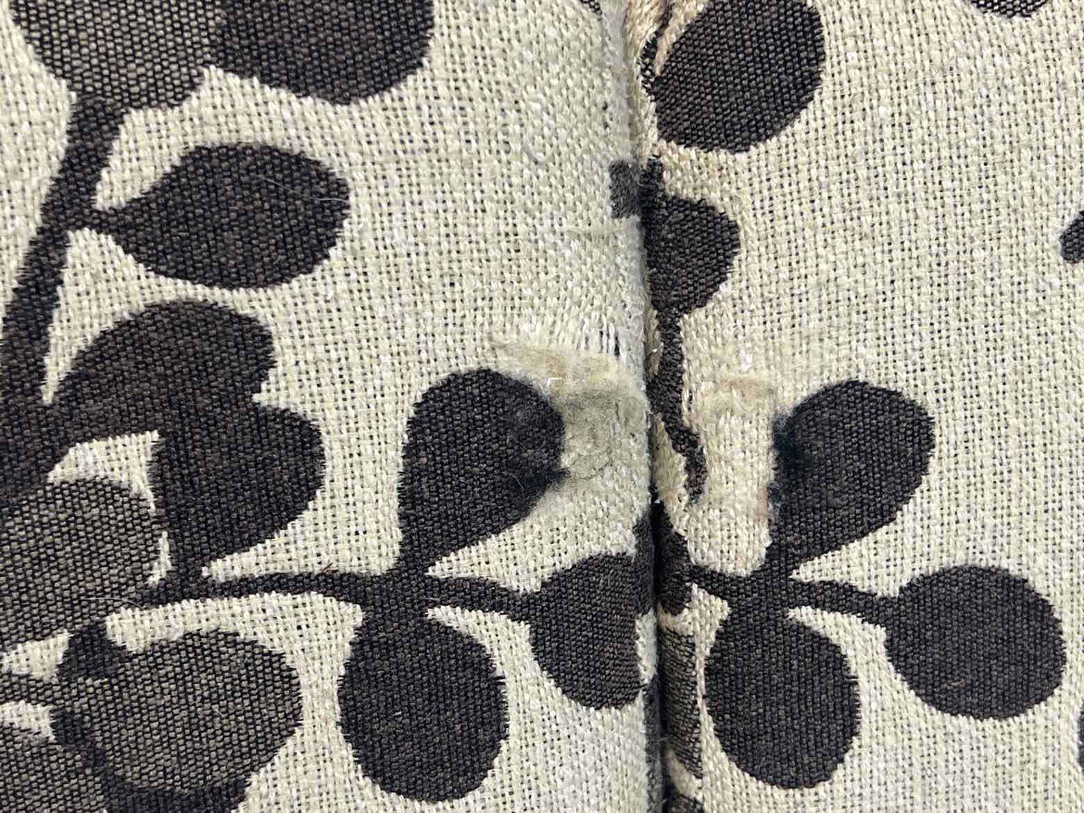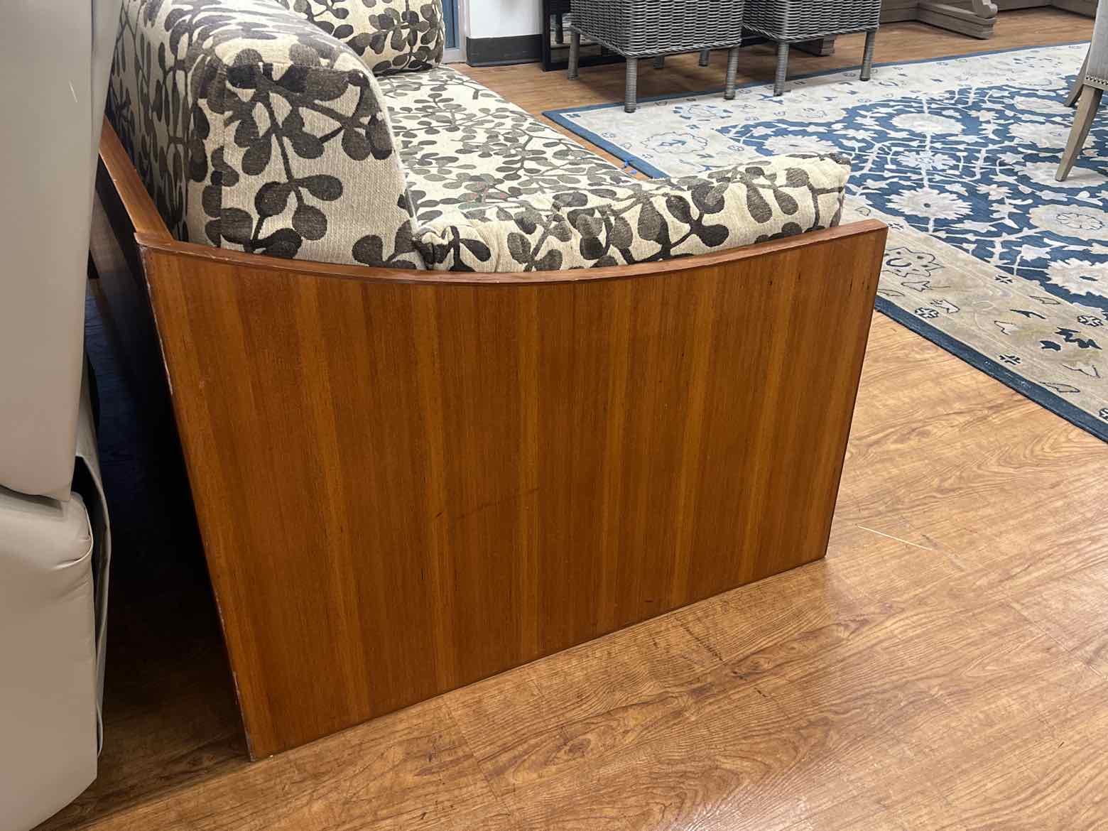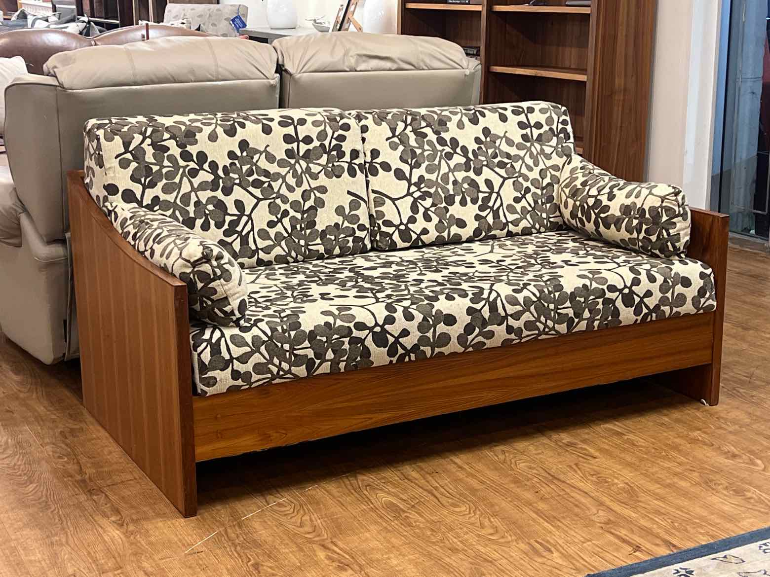 Teak mid-century queen futon with warm grey plant pattern upholstery