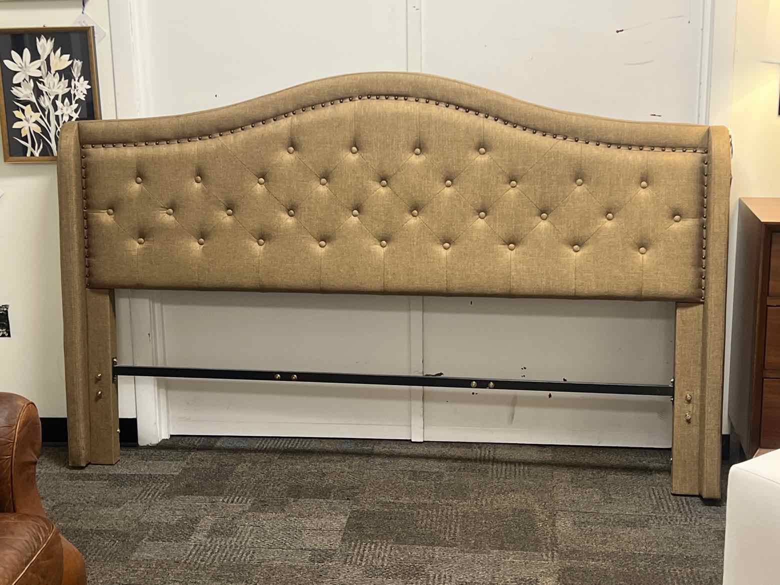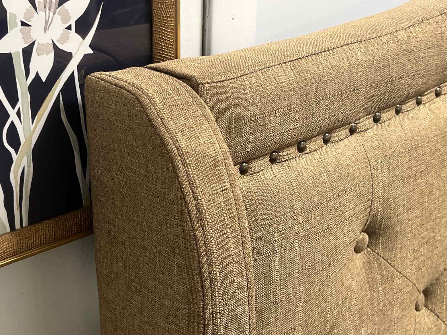 Brown tufted king bed w/ nailhead trim (hb, fb, rails, slats)