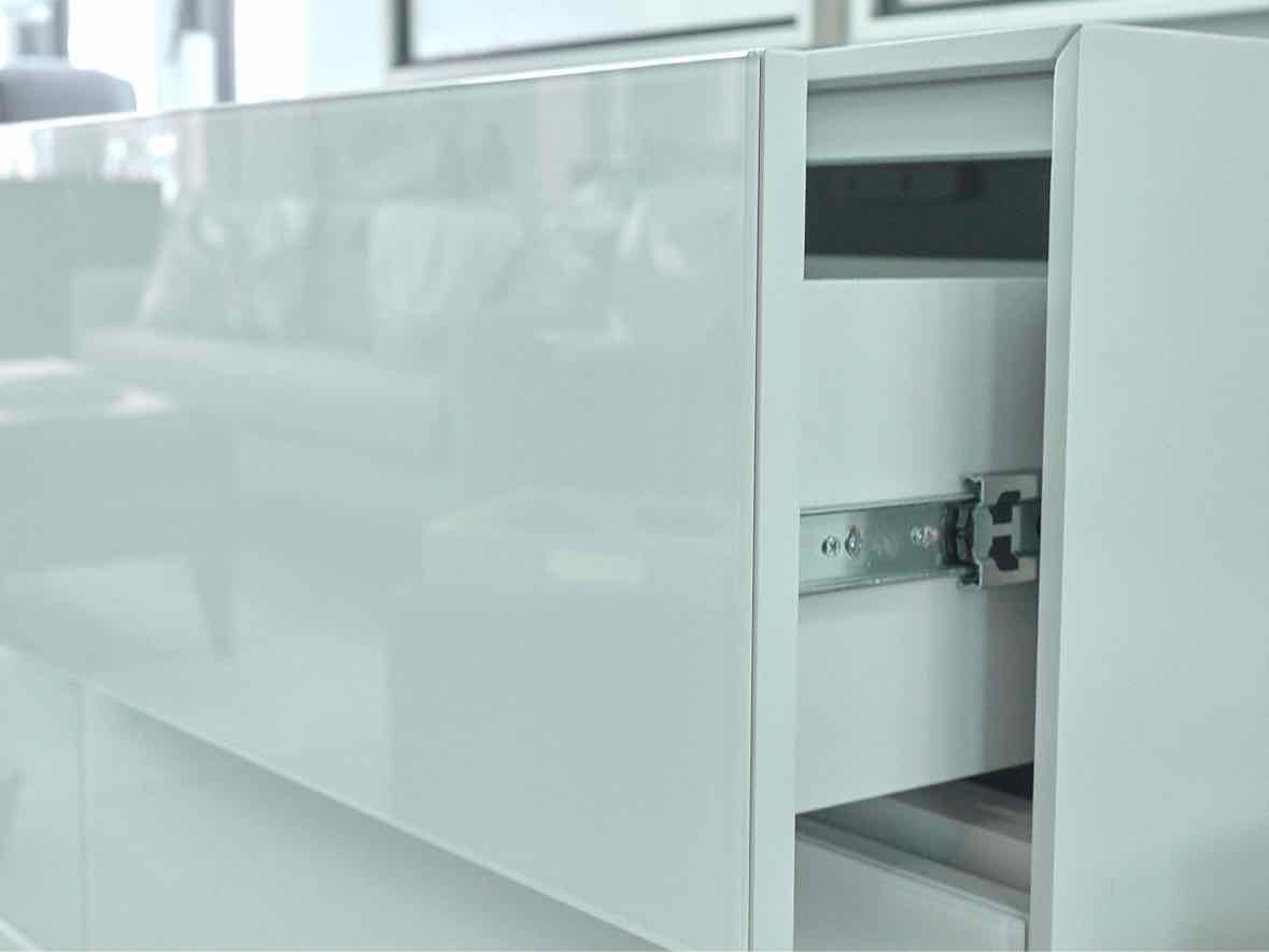 'Emilia' Six Drawer Dresser W/ Back Painted Glass Drawer Fronts in Light Gray 'Haze' Finish