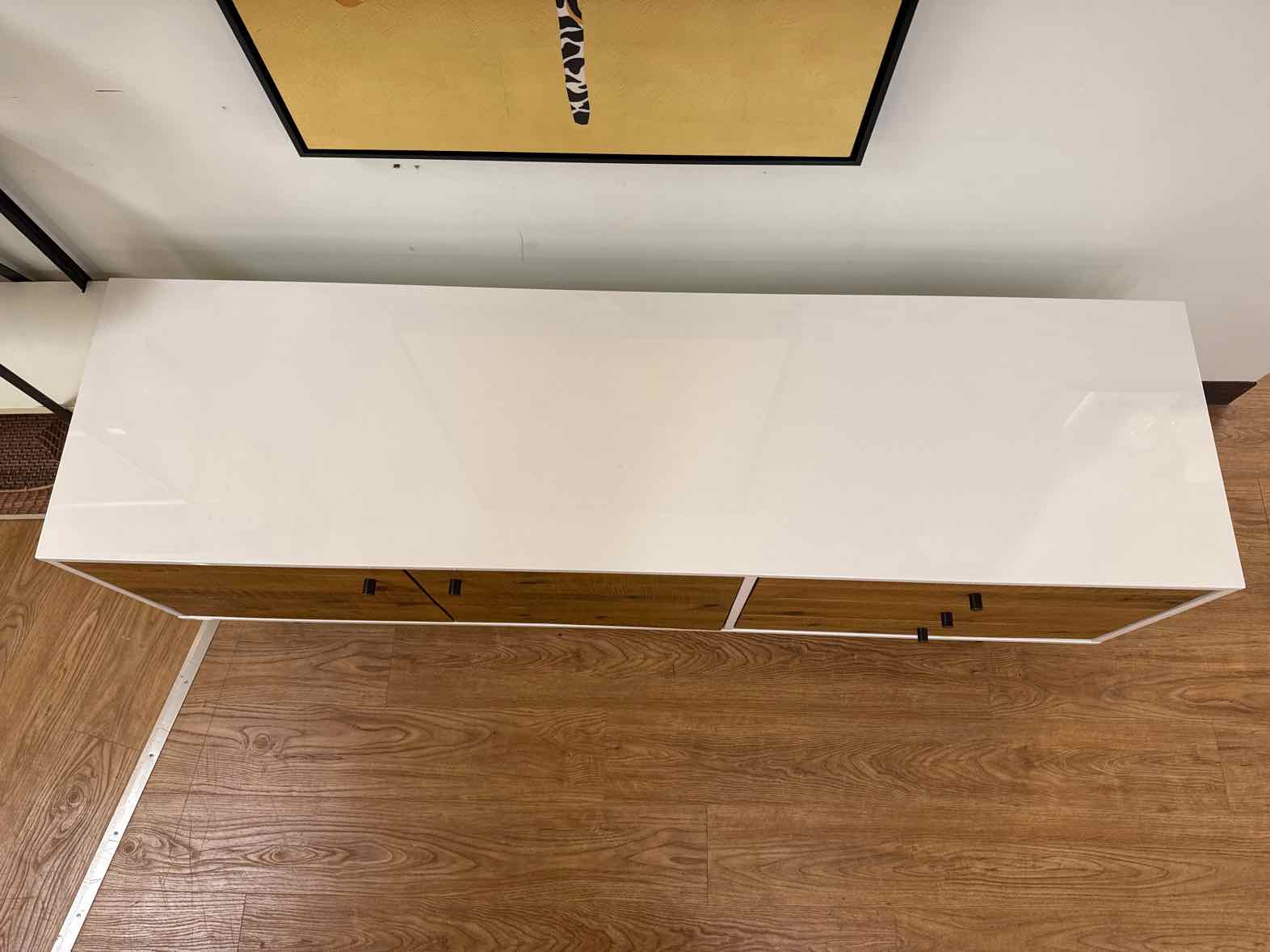 White lacquer and reclaimed wood console, 2 cabinets with adjustable shelves, 2 drawers and 1 cubby