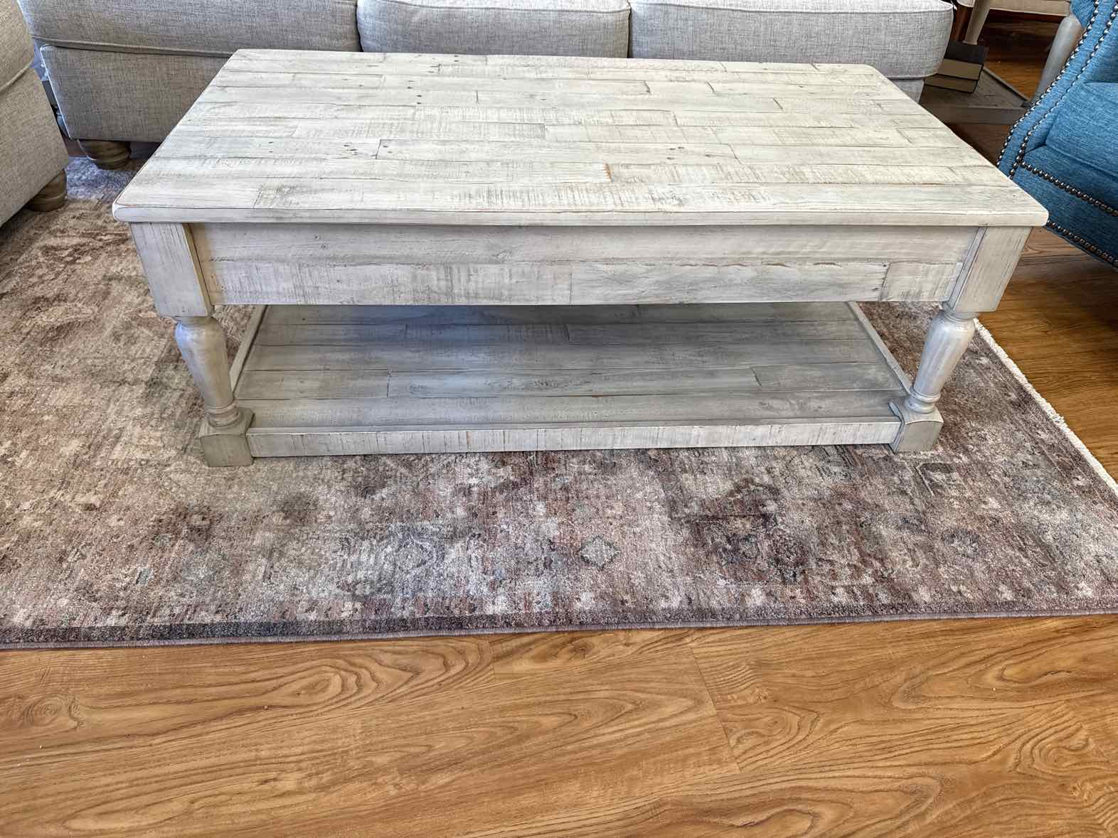 Whitewash reclaimed wood cocktail table with gallery shelf and drawers with black hardware