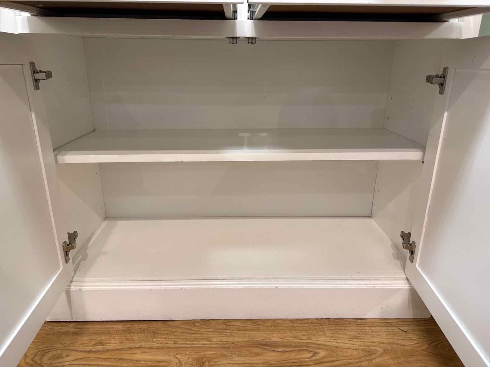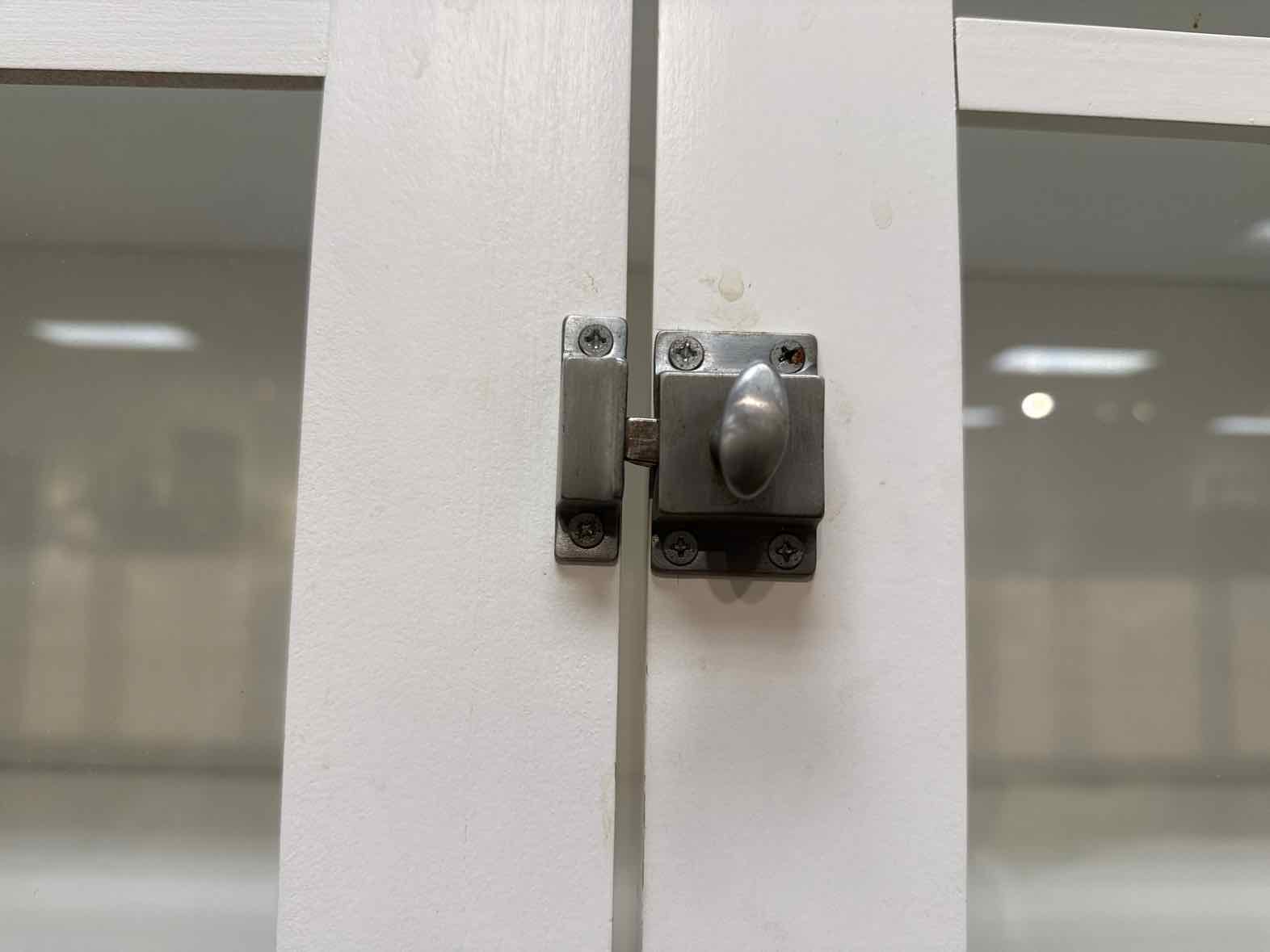 White cabinet with windowpane two-door top w/ 2 shelves, 2 drawers, lower cabinet with shelf, nickel accents