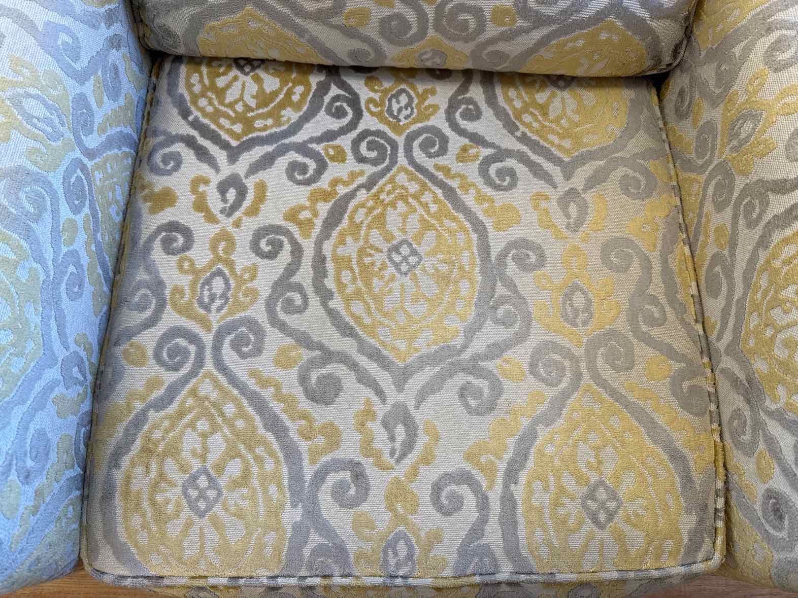 Swivel rocker chair with track arms and textured damask fabric in soft yellow and grey